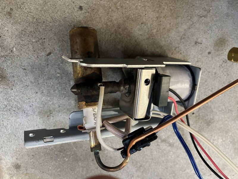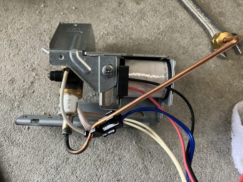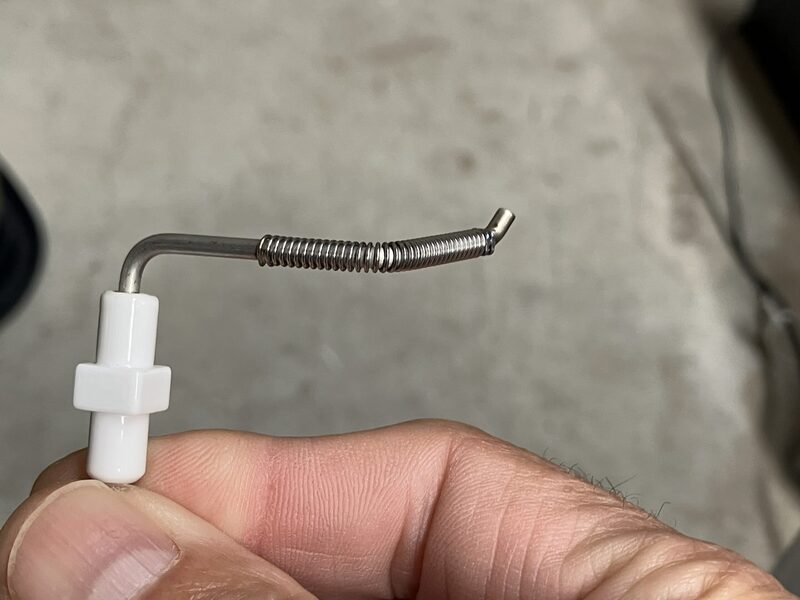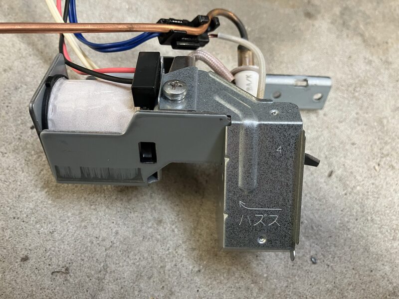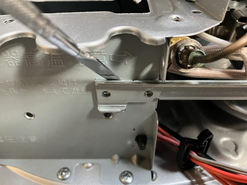 燃焼の心臓部が見えてきます。左側の棒が点火用、右のL型のほうが「フレームロッド」というパーツで燃焼状況を監視しているそうで通電が悪くなると停止させるみたいです。