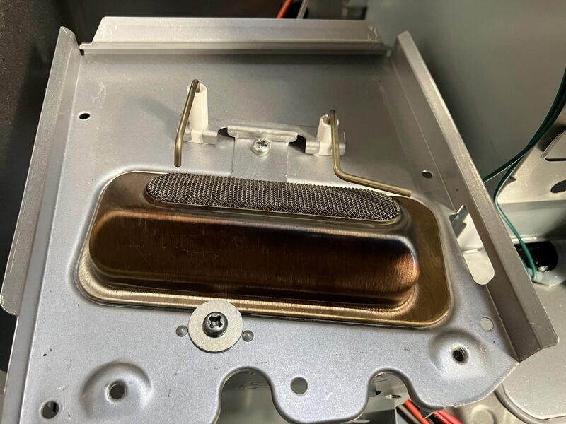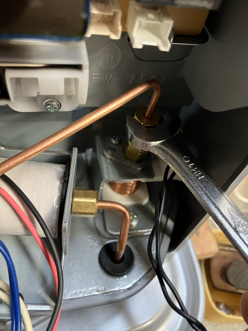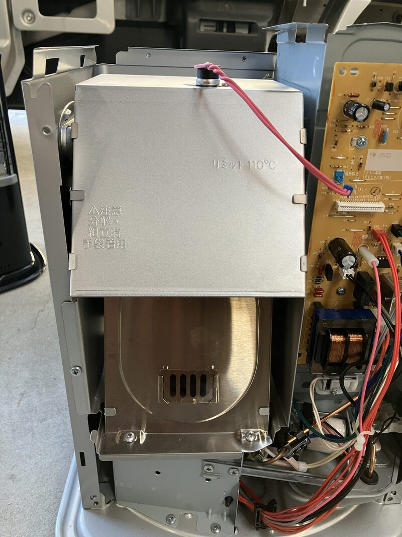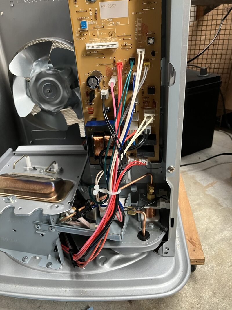 燃焼室のカバーを外します。手前下の2本、左の本体カバーに共締めの1本、さらに背面の本体カバー共締めの1本のビスを外すとともに基盤へのコネクターを抜いた後、前側に引き出します。