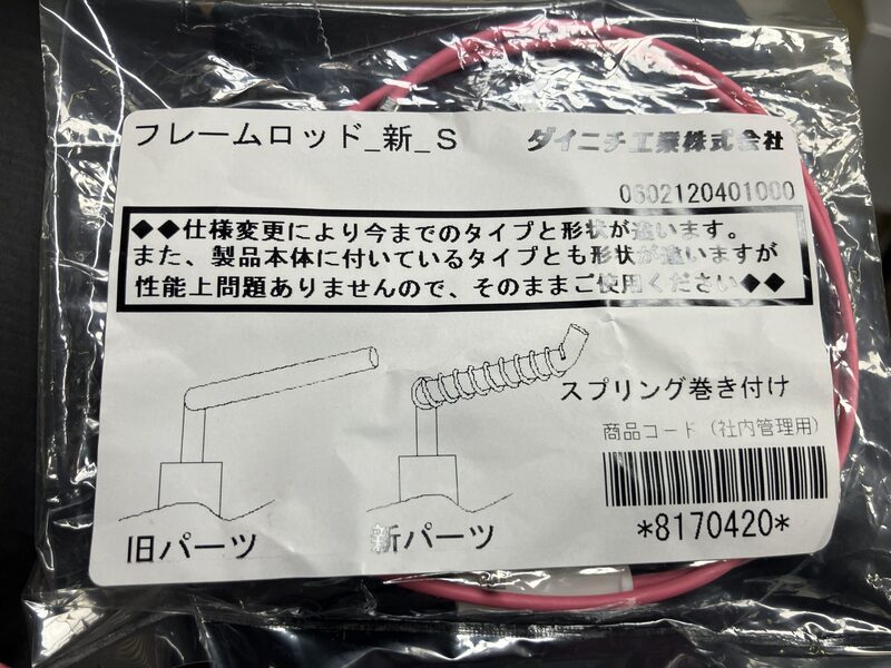 交換部品のフレームロッドです。改良品でバネみたいな線が巻き付けられています。