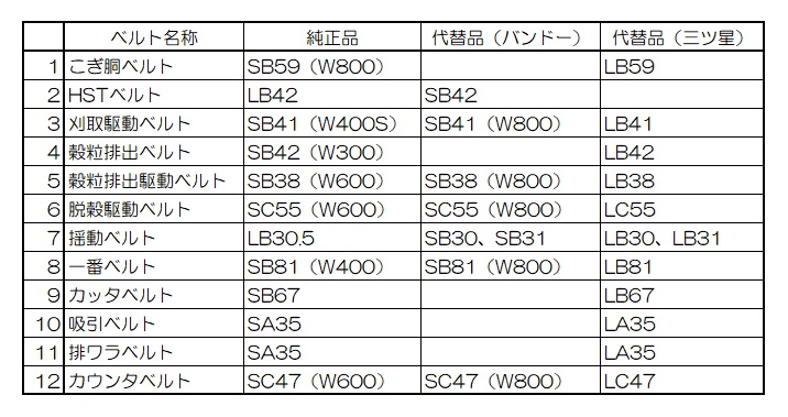 HV218(グレンタンク仕様)に使われているVベルトの一覧です、12か所あります。